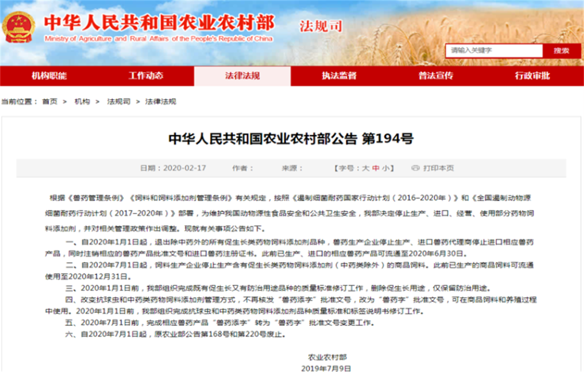 自農(nóng)業(yè)農(nóng)村部第194號公告,明確要求自2020年7月1日起,飼料生產(chǎn)企業(yè)停止生產(chǎn)含有促生長類藥物飼料添加劑(中藥類除外)的商品飼料,飼料全面禁抗的時代已經(jīng)來臨!